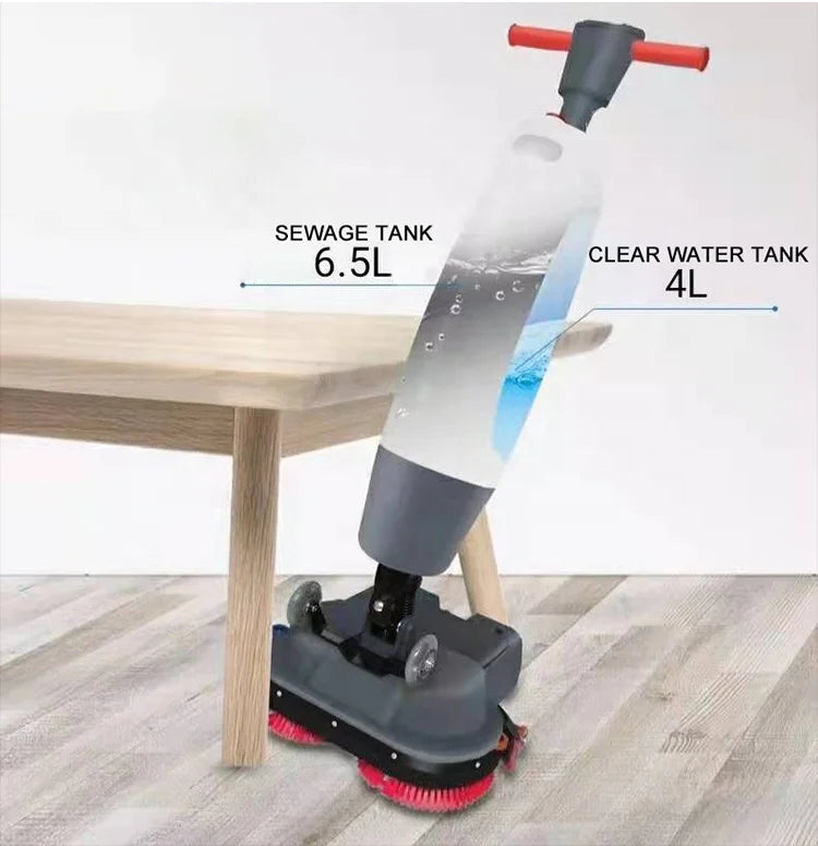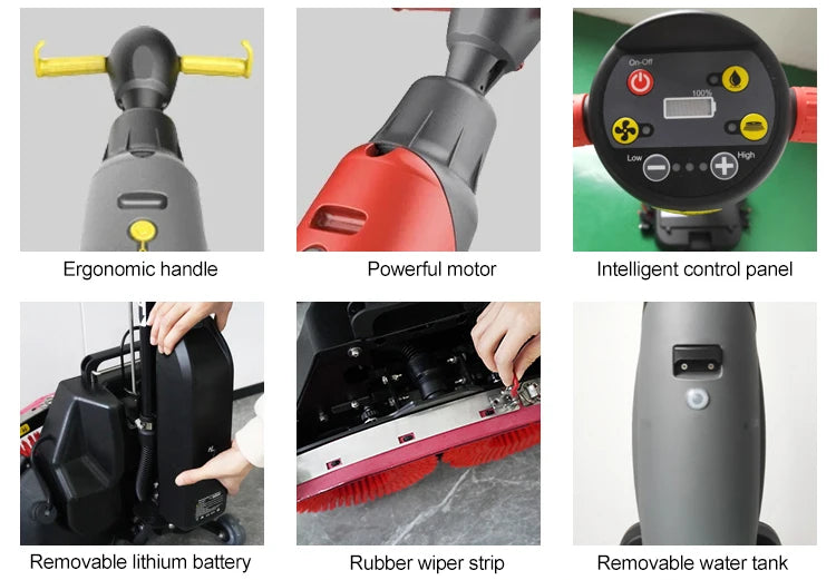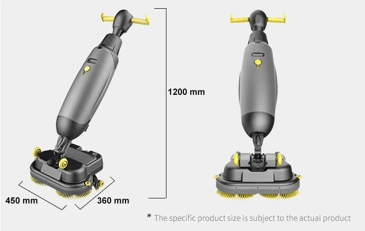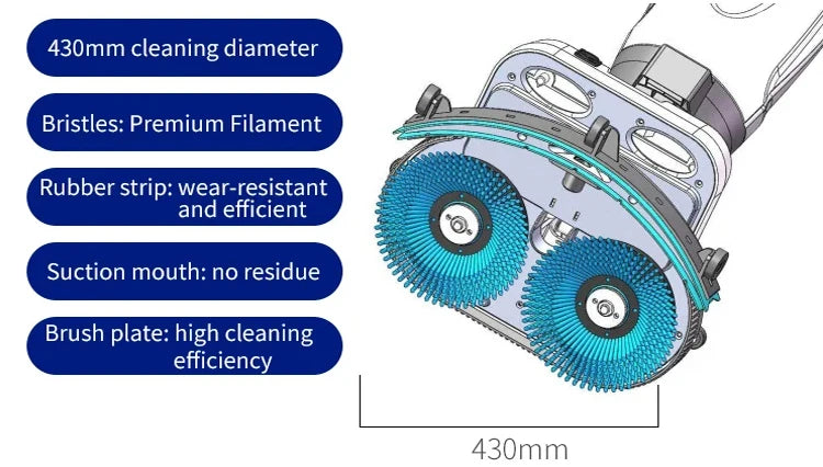 1. Strong cleaning ability: Double brush discs rotate at high speed to enhance cleaning force, while ensuring complete recovery of sewage and keeping the ground dry. 2. High efficiency: Equipped with two 9-inch brush discs for high-speed cleaning, with a cleaning efficiency of 1200 m²/hour.