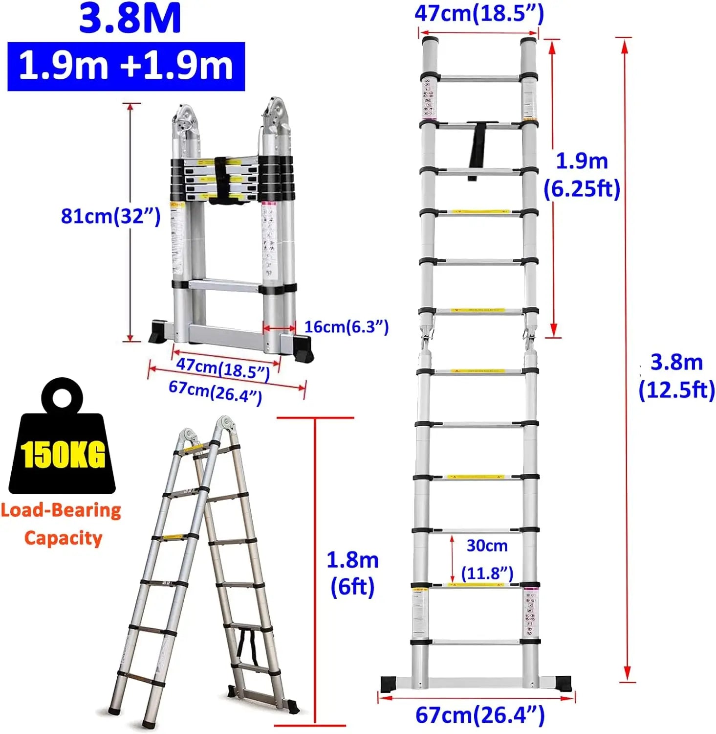 Extension and Retraction Design - Design with inward slide latches, you can adjusts rung by rung in 30cm increments to reach and retract any desired height; protection spacers avoid bumping and friction during retraction. Fully extended height is 3.8m/12.5ft.