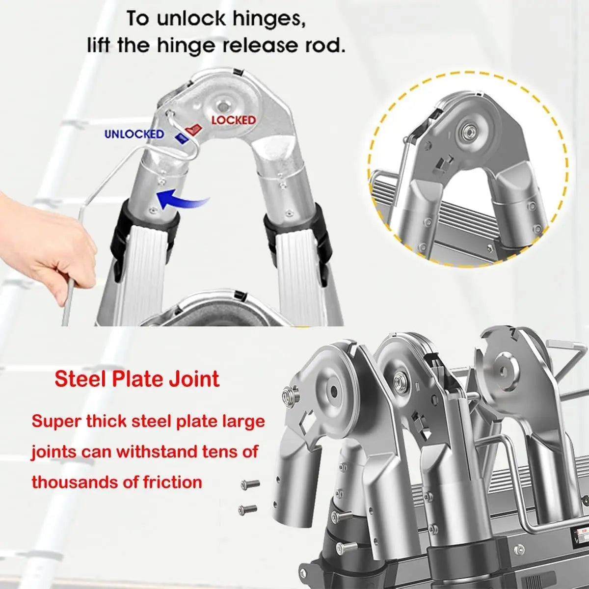 ◆ Please extend the ladder to the height that you want first, then turn it into A-Frame (Make sure the hinge&release rod be locked).
